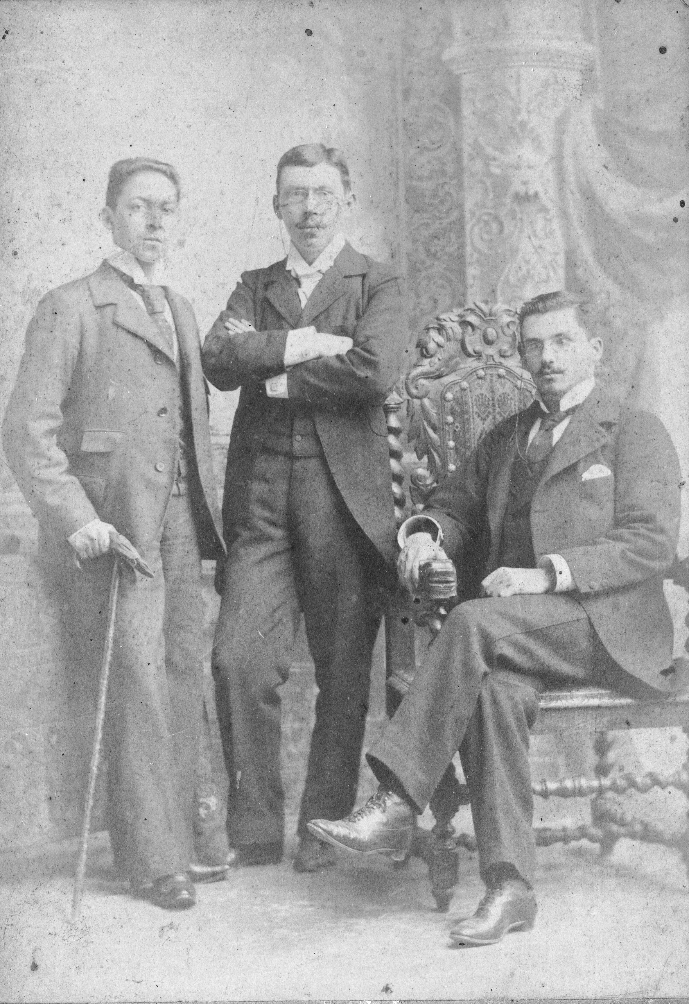 Fotografía de José Fidel Tristán sentado, Roberto Brenes Mesén de brazos cruzados y Flores Tinoco con bastón. Esta Fotografía forma parte del documento 166 del Fondo Fidel Tristán. Chile. Santiago