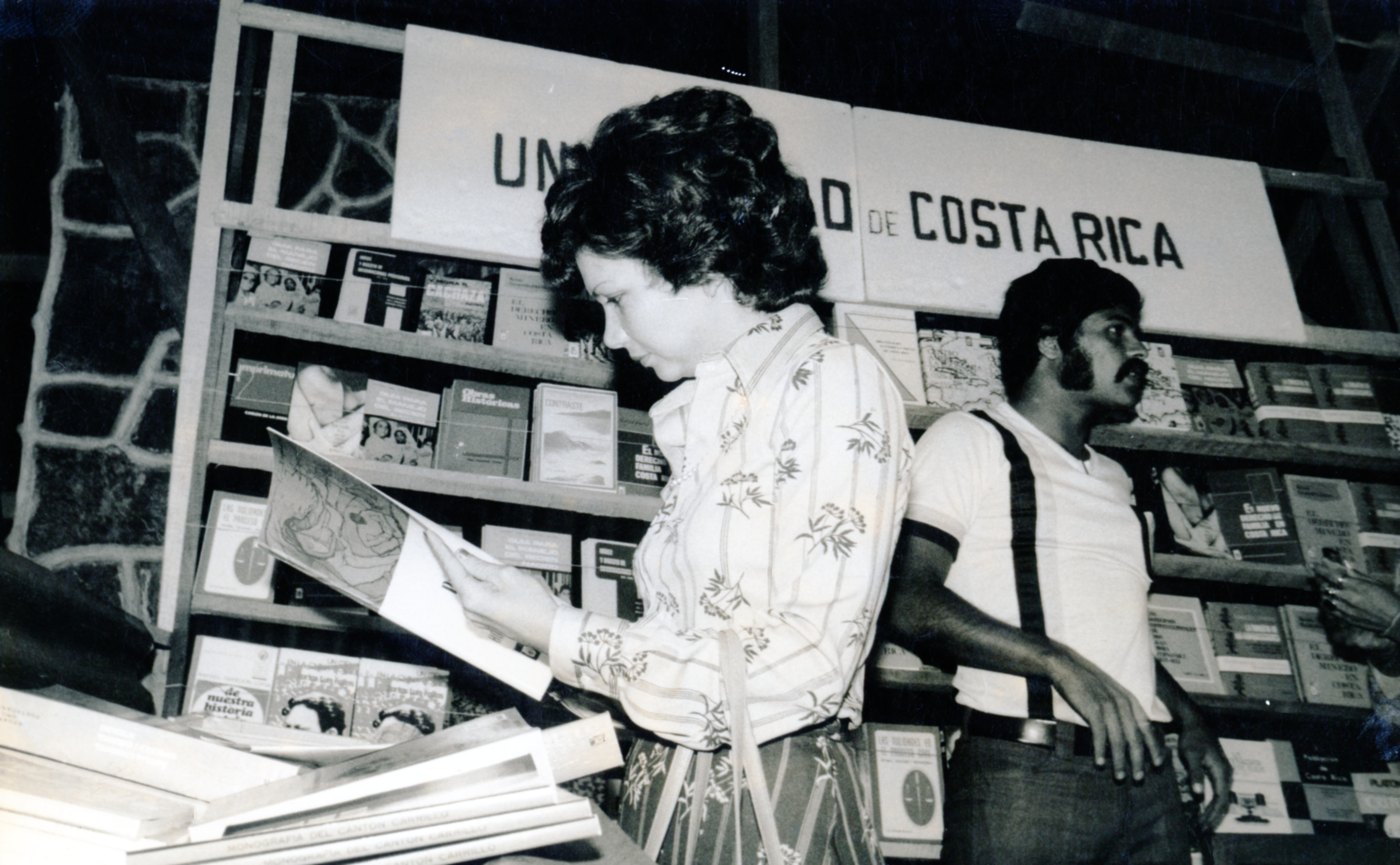 Fotografías con imágenes de la VII Feria del Libro, realizada en el Parque Central. Aparece la Dra. Marina Volio de Trejos Ministra de Cultura, Juventud y Deportes, recorriendo la misma San José